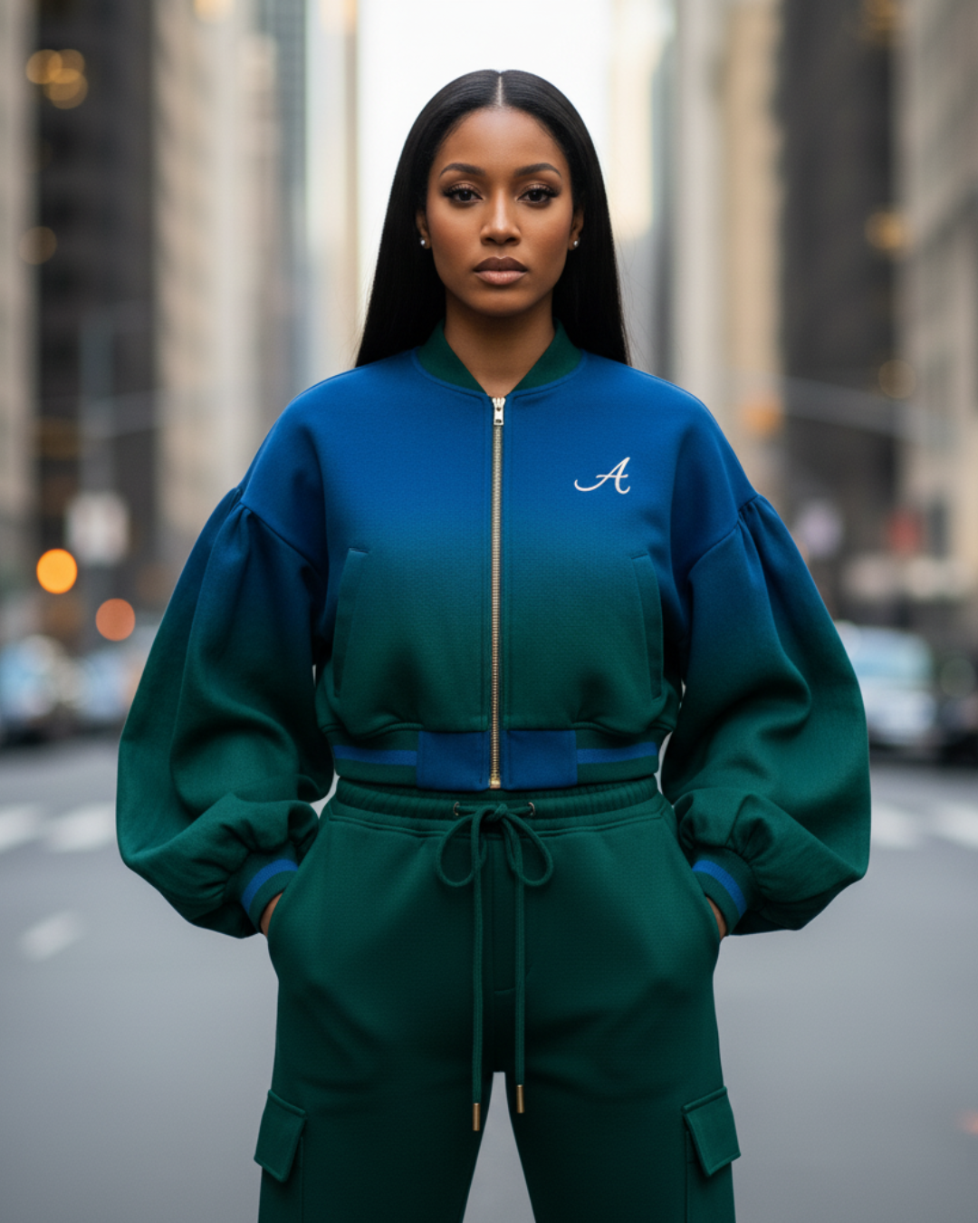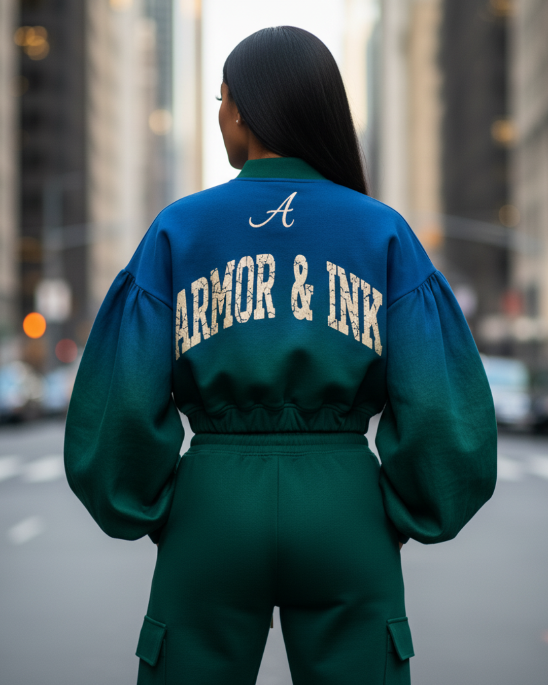 Step into a statement piece that fuses luxury craftsmanship with urban resilience. Our Azure Blue & Emerald Green Infused Bomber transcends ordinary outerwear — it's Armor reimagined in living color.